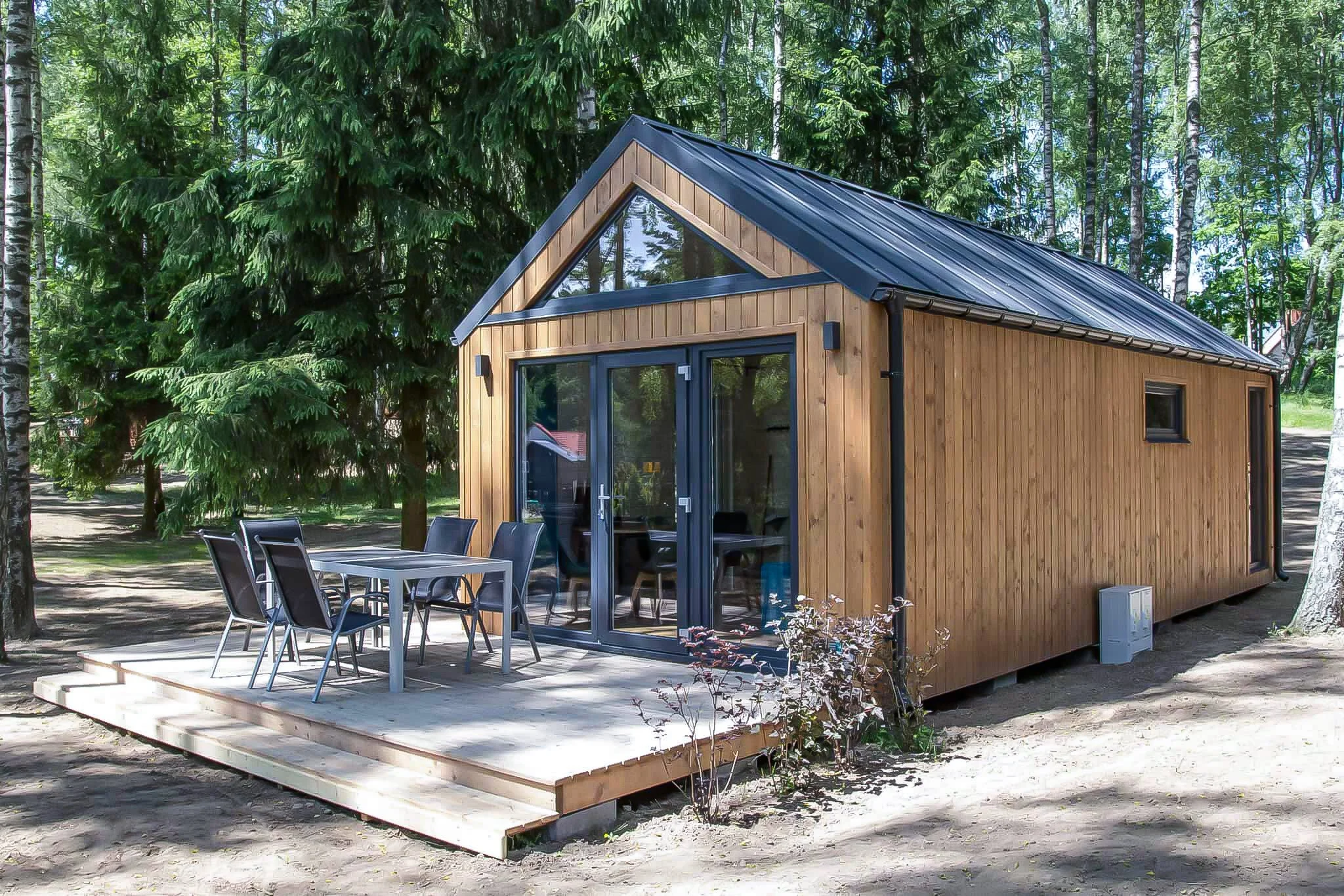 This summer cabin features a coSy living room with a kitchenette and loft, a separate bedroom, and a bathroom with a shower. It covers 35 square meters and is designed to comfortably accommodate a family of four. An open wooden terrace can be added for an additional cost.